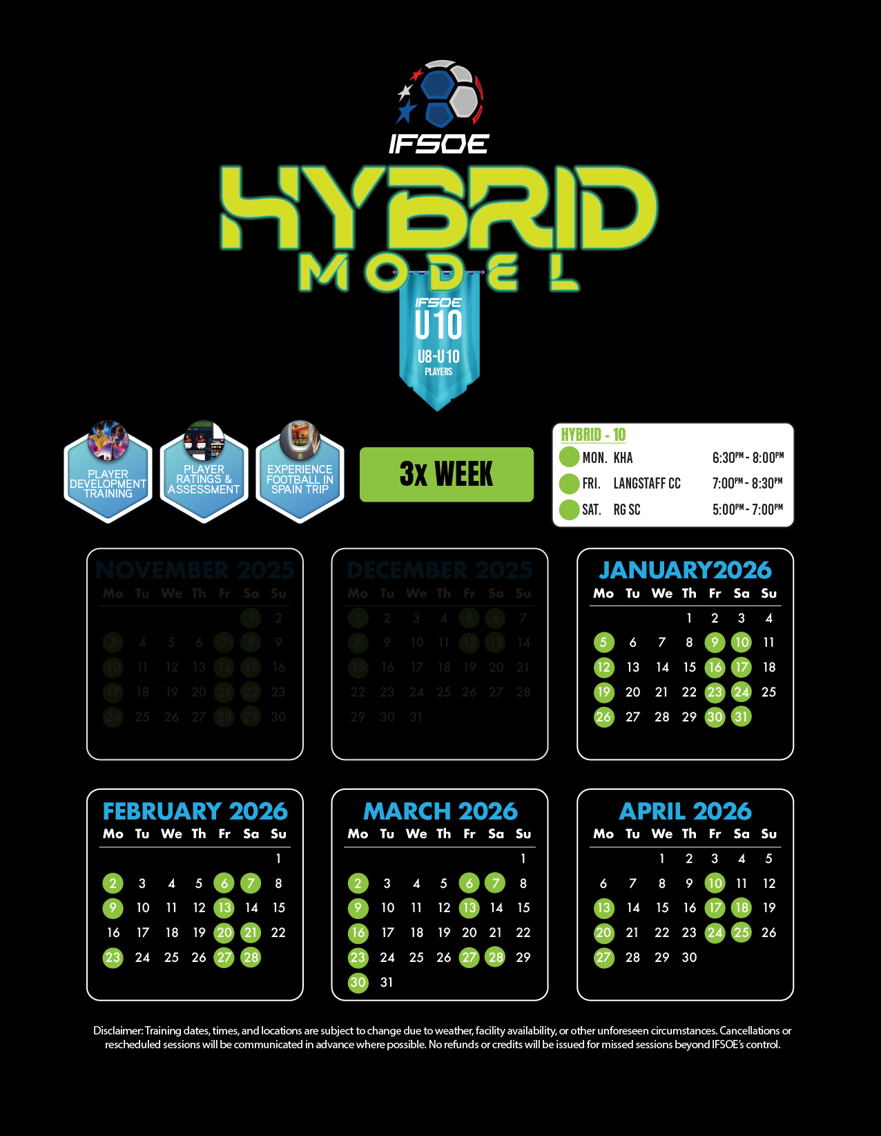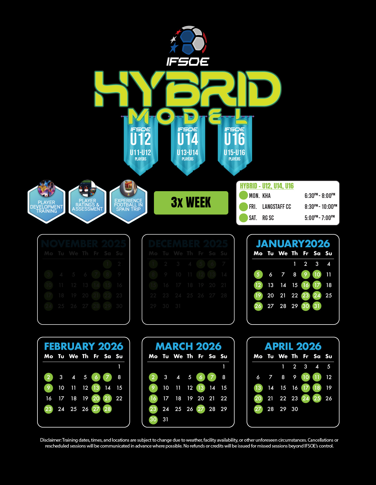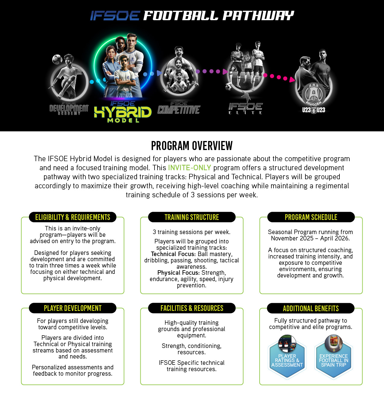 Experience the ultimate in player development with the IFSOE Hybrid Model. This INVITE ONLY program is tailored to meet the demands of aspiring footballers, this program offers a unique opportunity to train in a competitive way while honing skills within IFSOE.